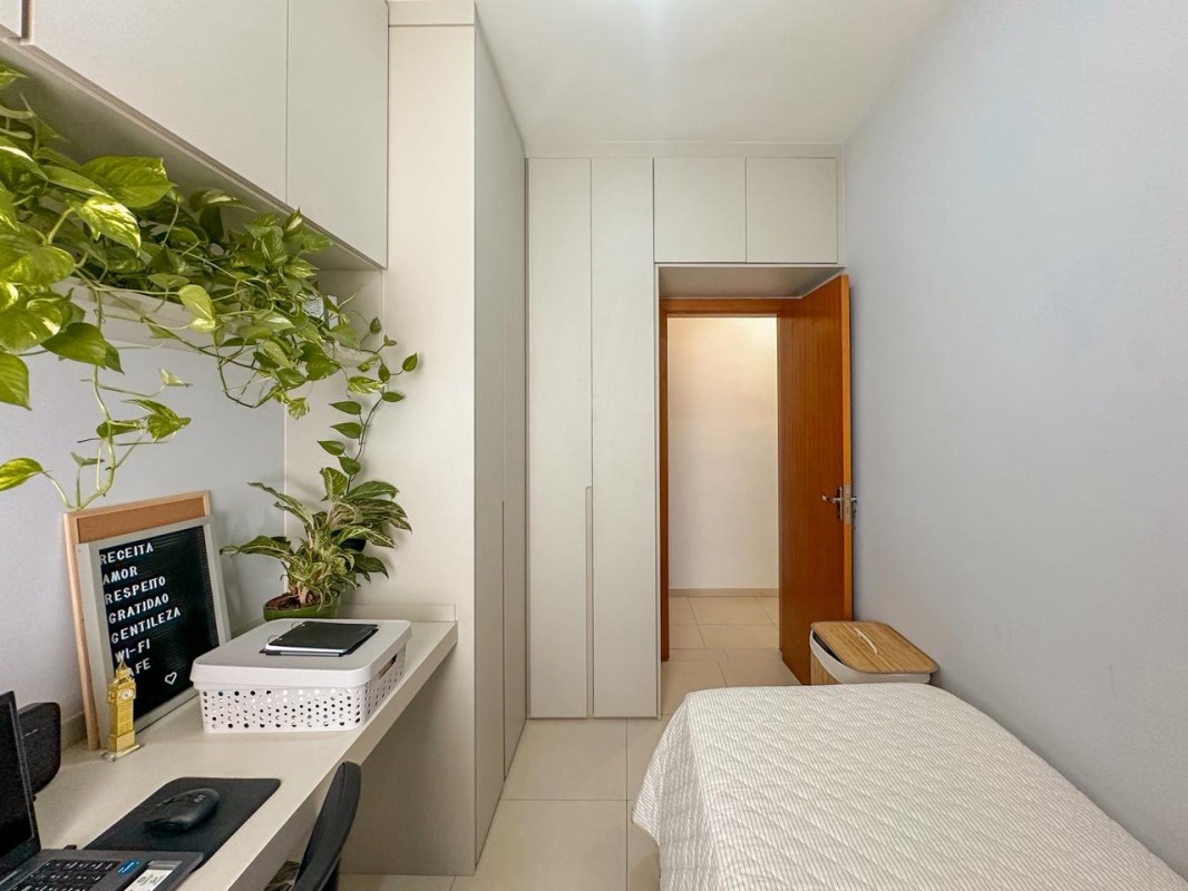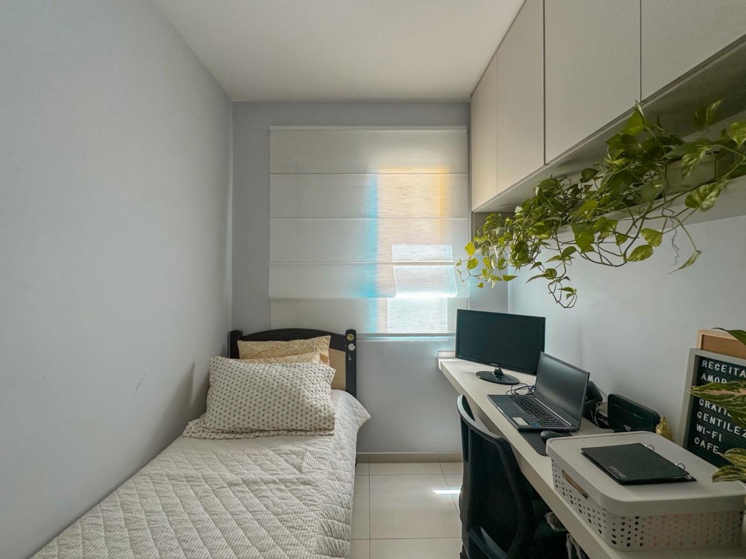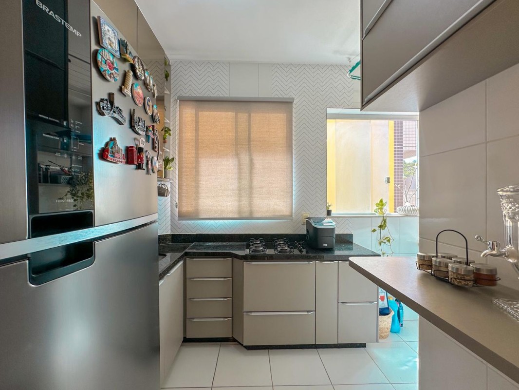 Sala ampla para 2 ambientes, cozinha rica em armários e área de serviço. Na área íntima são 2 quartos com armários, sendo 1 suíte e 1 banheiro social.