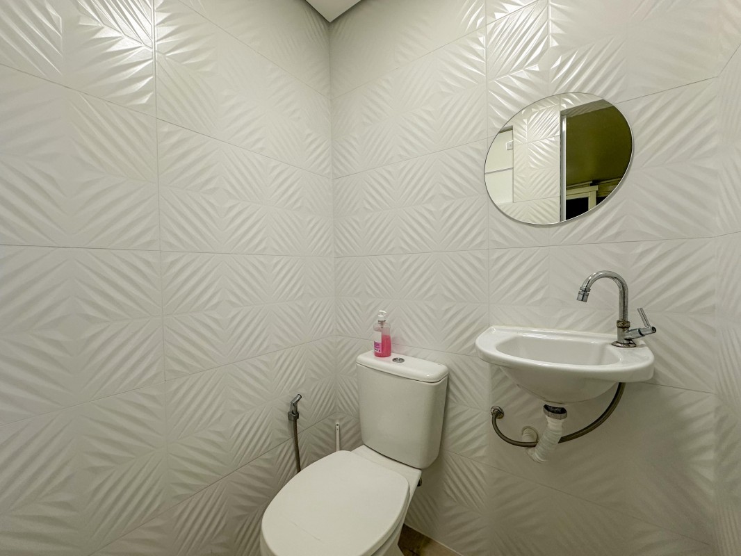 1º pavimento: sala ampla, cozinha com armários, banheiro social e 3 quartos, sendo 1 suíte climatizada.