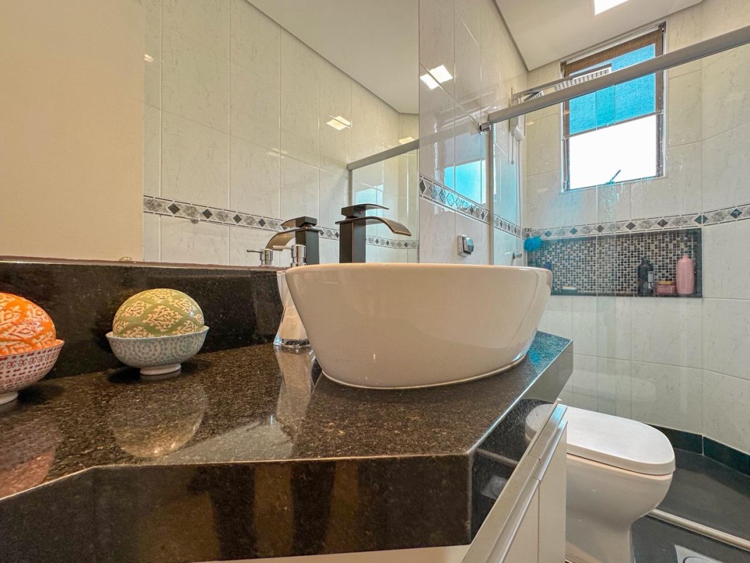2º pavimento: Sala de TV e espaço gourmet completíssimo com churrasqueira a carvão, piscina com aquecimento solar, sauna, banheiro social e lavanderia independente.